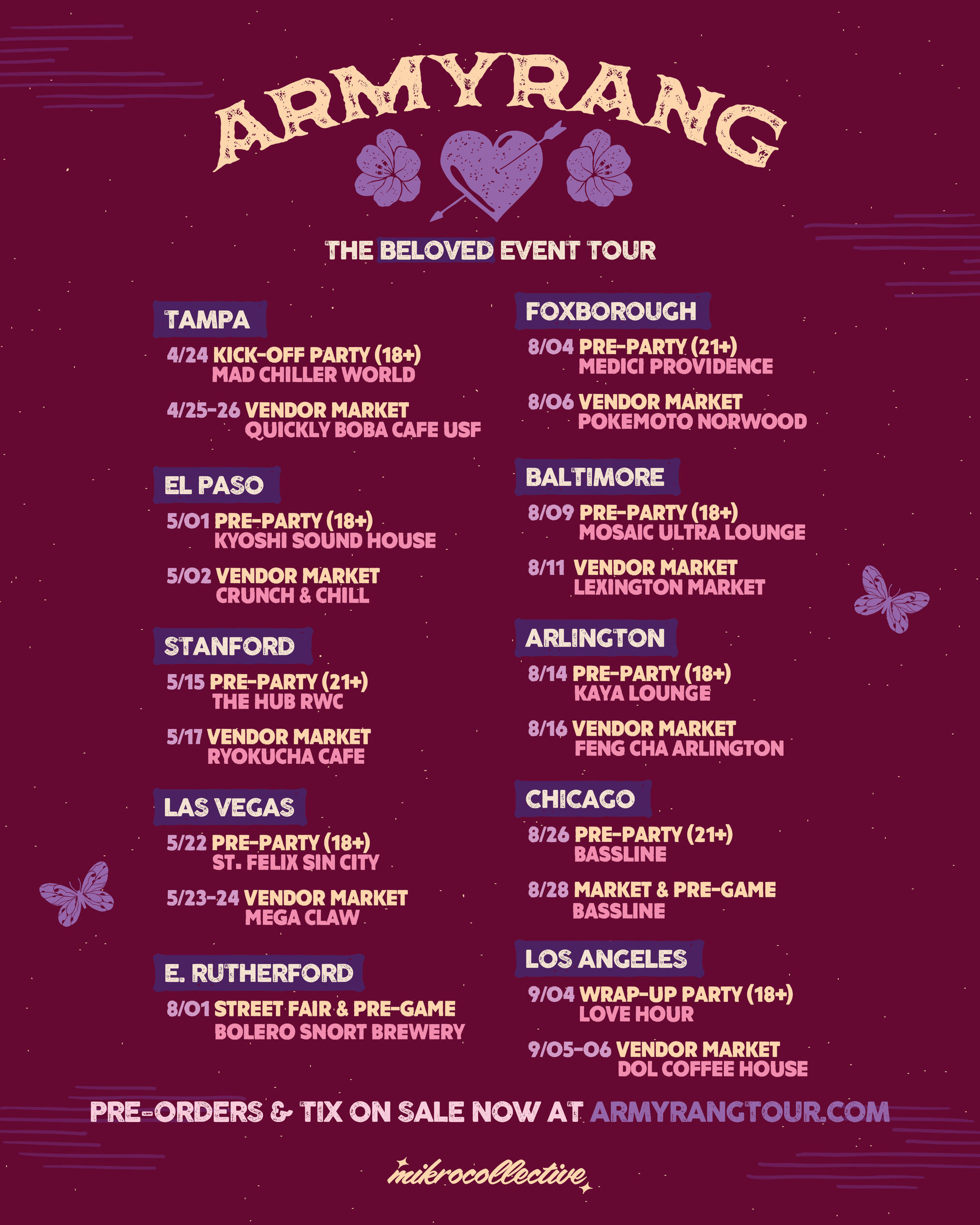 These events are brought to you by ✨*Mikro Collective✨, a cooperative effort by Army With Fun, BTS Tarot Project, Flower Vantae & Purple You Orlando! Follow us on Instagram to stay up to date with the latest Event Tour news!Can't wait to see y'all on tour! Borahae! 💜